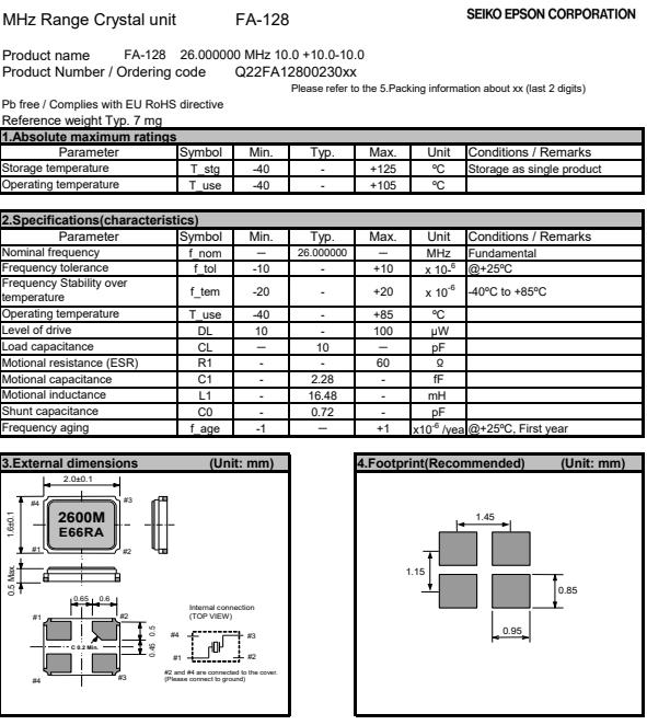 Q22FA1280023000 | 2 x 1.6 x 0.5mm | FA-128 | 26.000000 MHz | 10 pF | +/-10 ppm |