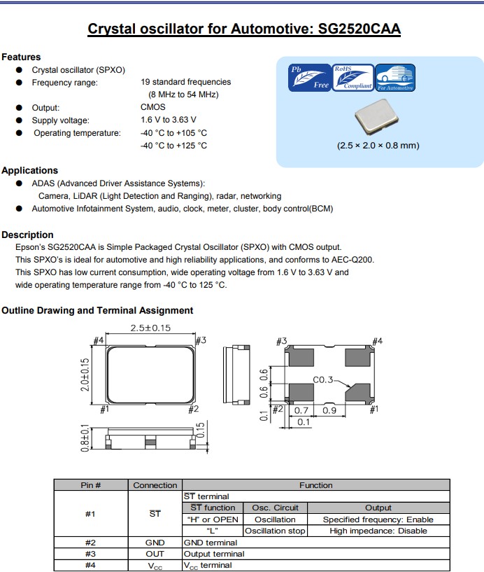 愛普生晶振SG2520CAA是一款具有CMOS輸出的簡單封裝石英晶體振蕩器(SPXO),小體積尺寸2.5x2.0mm四腳貼片晶振,有源晶振,頻率范圍:8MHz至54MHz,1.6V至3.63V的寬工作電壓以及寬工作溫度范圍-40℃至+105℃/+125℃,該產(chǎn)品具有超小型,輕薄型,低電流消耗,耐高溫晶振,耐熱、耐振、耐沖擊等優(yōu)良的耐環(huán)境特性,滿足無鉛焊接的高溫回流溫度曲線要求,符合AEC-Q200標(biāo)準(zhǔn),非常適用于汽車和高可靠性應(yīng)用,ADAS(高級駕駛輔助系統(tǒng)): 攝像頭、激光雷達(dá)(光探測和測距)、雷達(dá)、網(wǎng)絡(luò),汽車信息娛樂系統(tǒng)、音頻、時(shí)鐘、儀表、組合儀表、車身控制(BCM)等。
