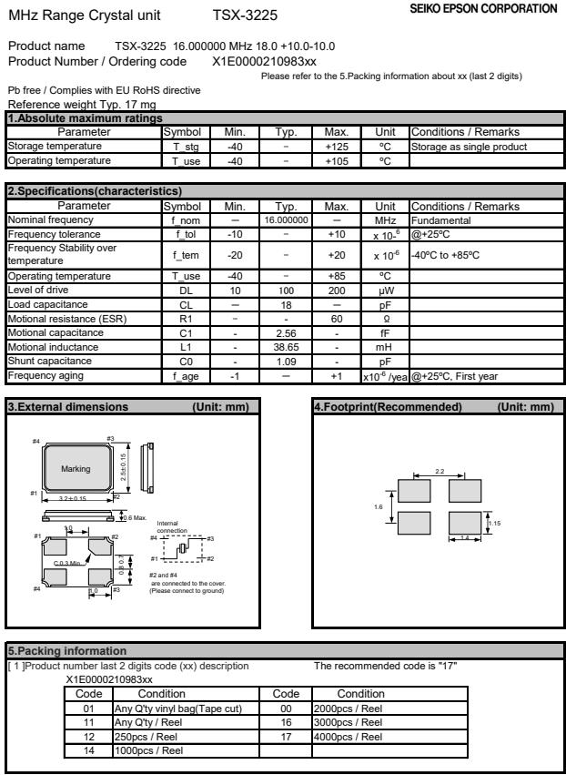 X1E000021098316 | 3.2 x 2.5 x 0.6mm | TSX-3225 | 16.000000 MHz | 18 pF | +/-10 ppm | +/-20 ppm | -40 to +85 °C |