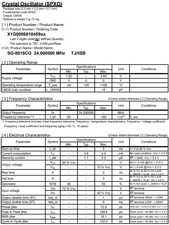 X1G005601050100 | SG-8018CG | 24.545454 MHz | 2.50 x 2.00 x 0.80 mm | CMOS | 1.620 to 3.630 V | -40 to 105 °C | +/-50 ppm |