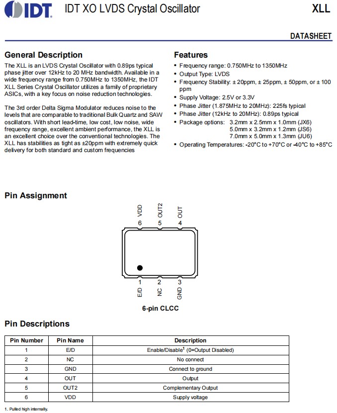 XLL73V005.000000X | IDT晶振 | LVDS | 3.3V | OSC VCXO 5.000MHZ SMD |
