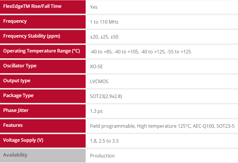 SiTime車用振蕩器相比石英振蕩器可靠性提高30倍,具有以下的特性與優(yōu)勢: - 滿足AEC-Q100標準一級(-40°C至+125°C)、二級(-40°C至+105°C)與寬泛的溫度要求(-55°C至+125°C)