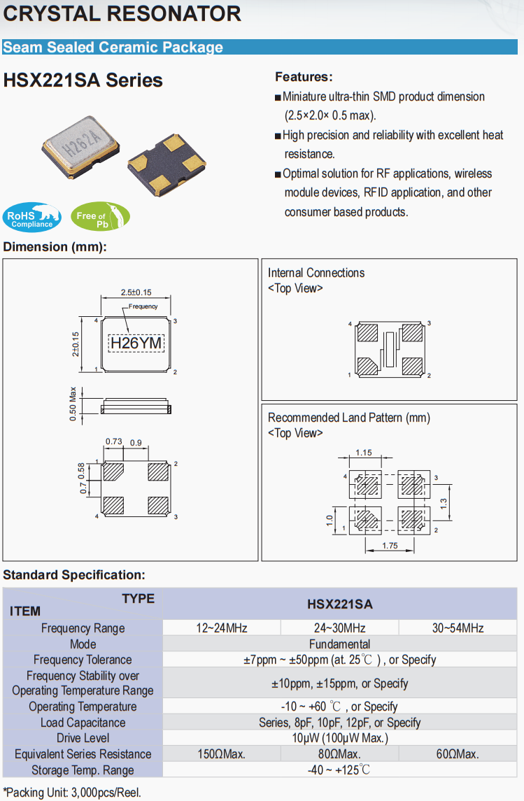 X2B026000B71HZ-HPR | 加高晶振 | HSX221SA | 26 MHz | ±10ppm | 7.2pF |