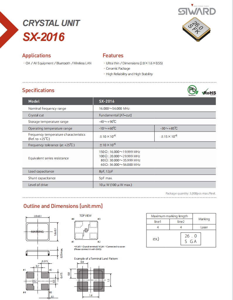 XTL501300-A292-004 | Siward晶振 | SX-2016 | 16 MHz | ±20ppm | 9pF | -40°C ~ 85°C |