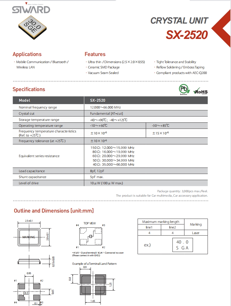 XTL581150-G47-223 | Siward晶振 | SX-2520 | 40 MHz | ±10ppm | 12pF | -30°C ~ 85°C |