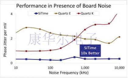 系統中的電源可能是不利于系統性能的主要噪聲源,并且在打開和關閉電源時會放大此噪聲.大部分噪聲可以通過無源濾波器和去耦電容器濾除.但是,仍然存在一些噪聲,電路板問題(例如接地反彈)會對時鐘抖動產生負面影響.電源噪聲靈敏度(PSNS)是模擬電路設計中使用的參數,它指示電路對電源噪聲的魯棒性.測試結果表明,SiTime振蕩器的PSNS比石英器件好得多,包括設計用于滿足高頻,低抖動要求的石英表面聲波(SAW)振蕩器.